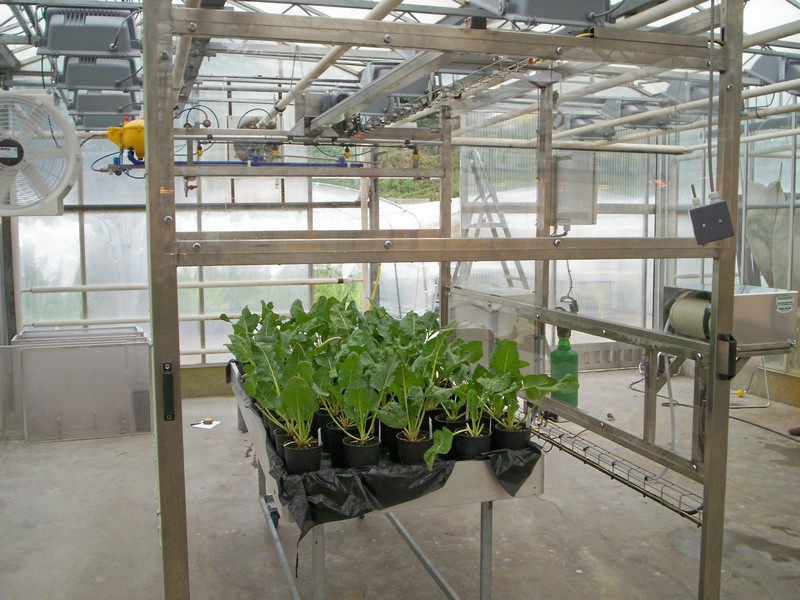 Cámara de pulverización para pruebas de laboratorio con plantas en vasija. Control automático de los parametros : caudal, presión, tasa, posibilidad de registrar todos los datos de functionamiento.Contrucción bajo sus pliego de condiciones..